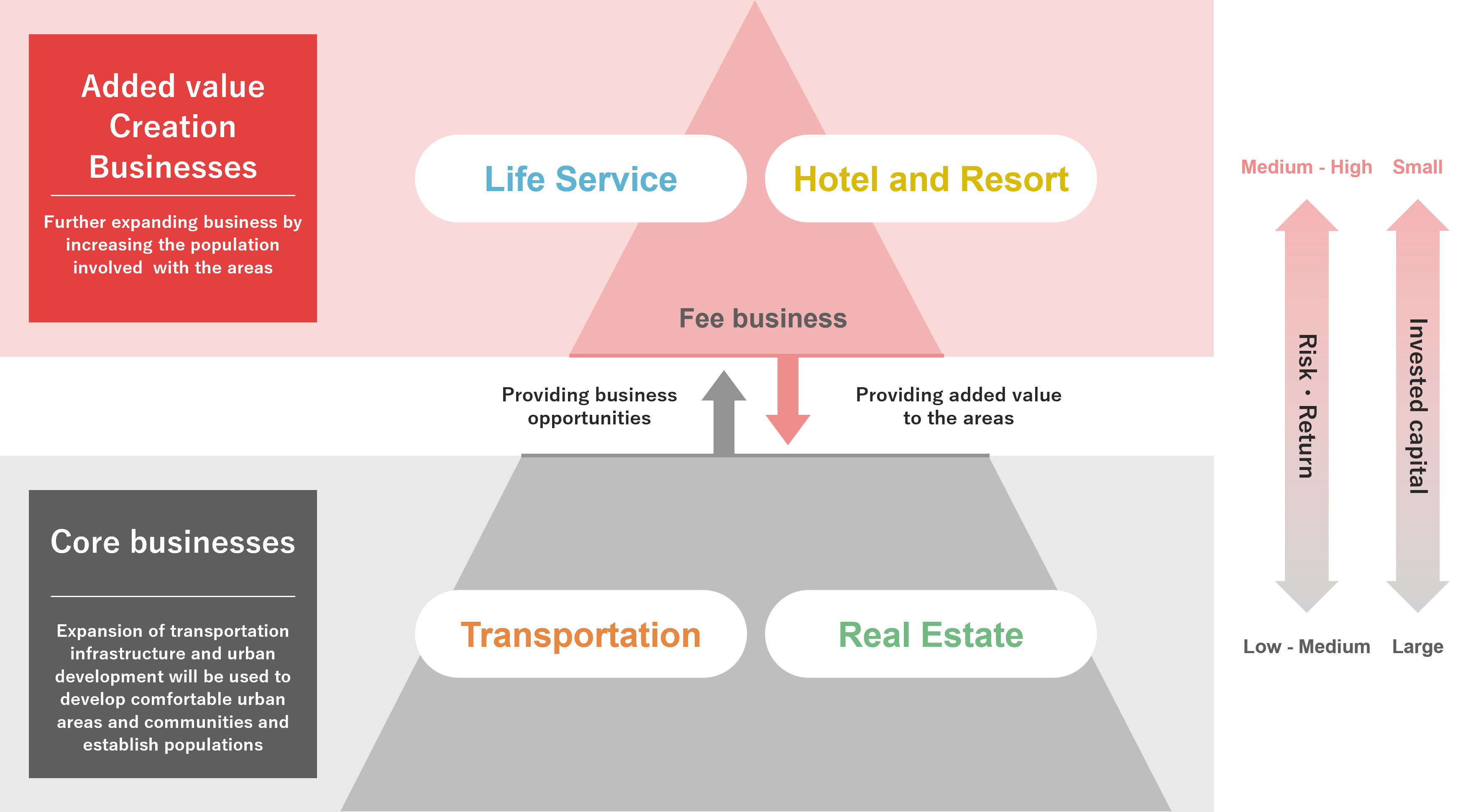 With the transportation and real estate businesses as the foundation of the company's operations, we aims to increase area value and expand profits by combining the life service and hotel and resort businesses, which require relatively low capital investment and can be expected to generate high returns.