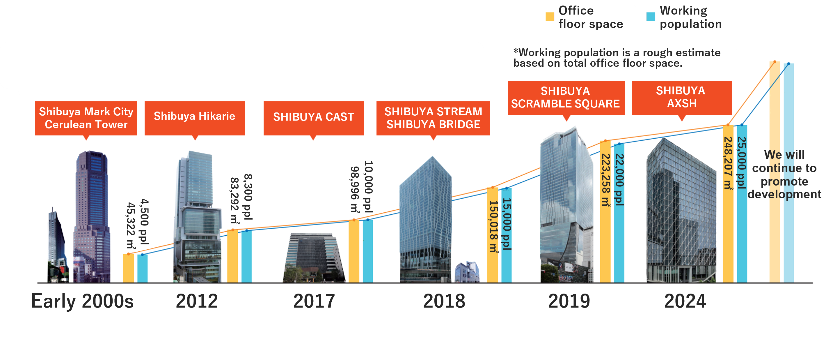 The number of workers and visitors in Shibuya steadily increased due to our continued development and increased supply of office space since 2000. We will continue to actively promote our business, aiming to further increase the number of people involved, create synergies, and achieve sustainable growth in the area.
