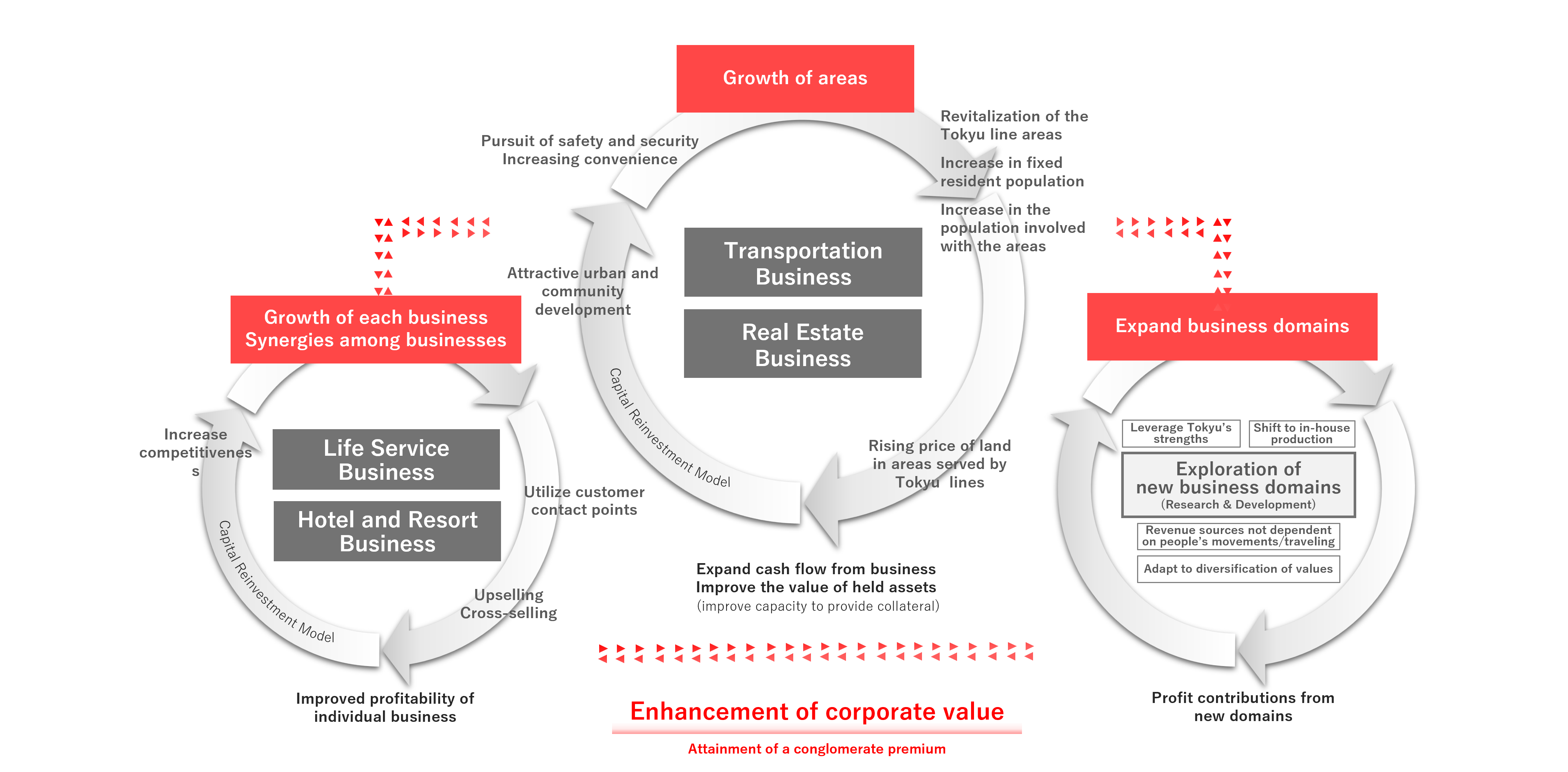 Our long-term reinvestment-based business model will achieve sustained enhancement of corporate value by area growth and synergies among businesses. We aim to realize conglomerate premium by maximizing three-cycle synergy.