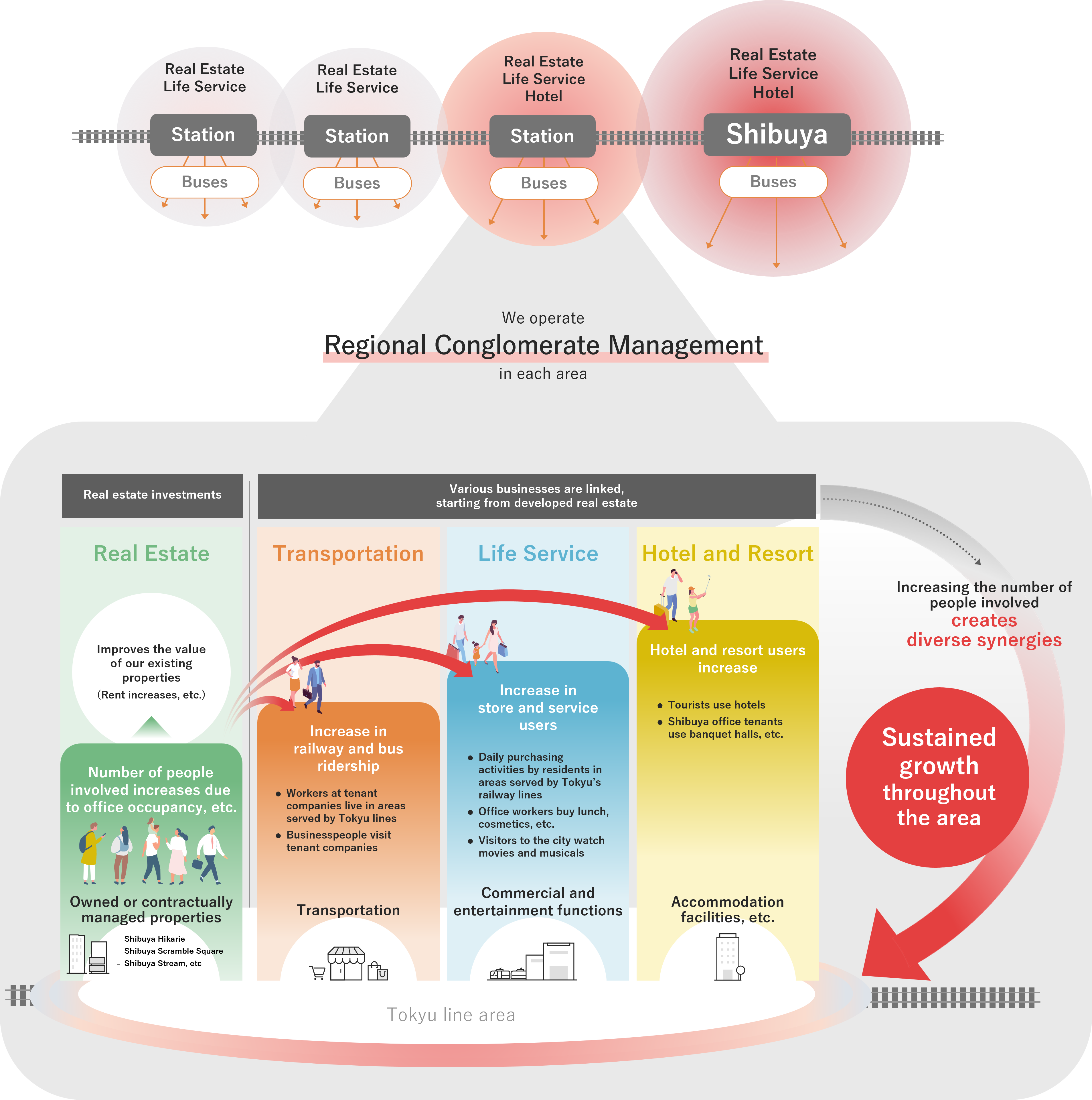 "Regional conglomerate management" is to improve area value and generate earnings in a multi-layered manner by continuously making additional investments in the area (Capital Reinvestment Model to the Tokyu line areas).