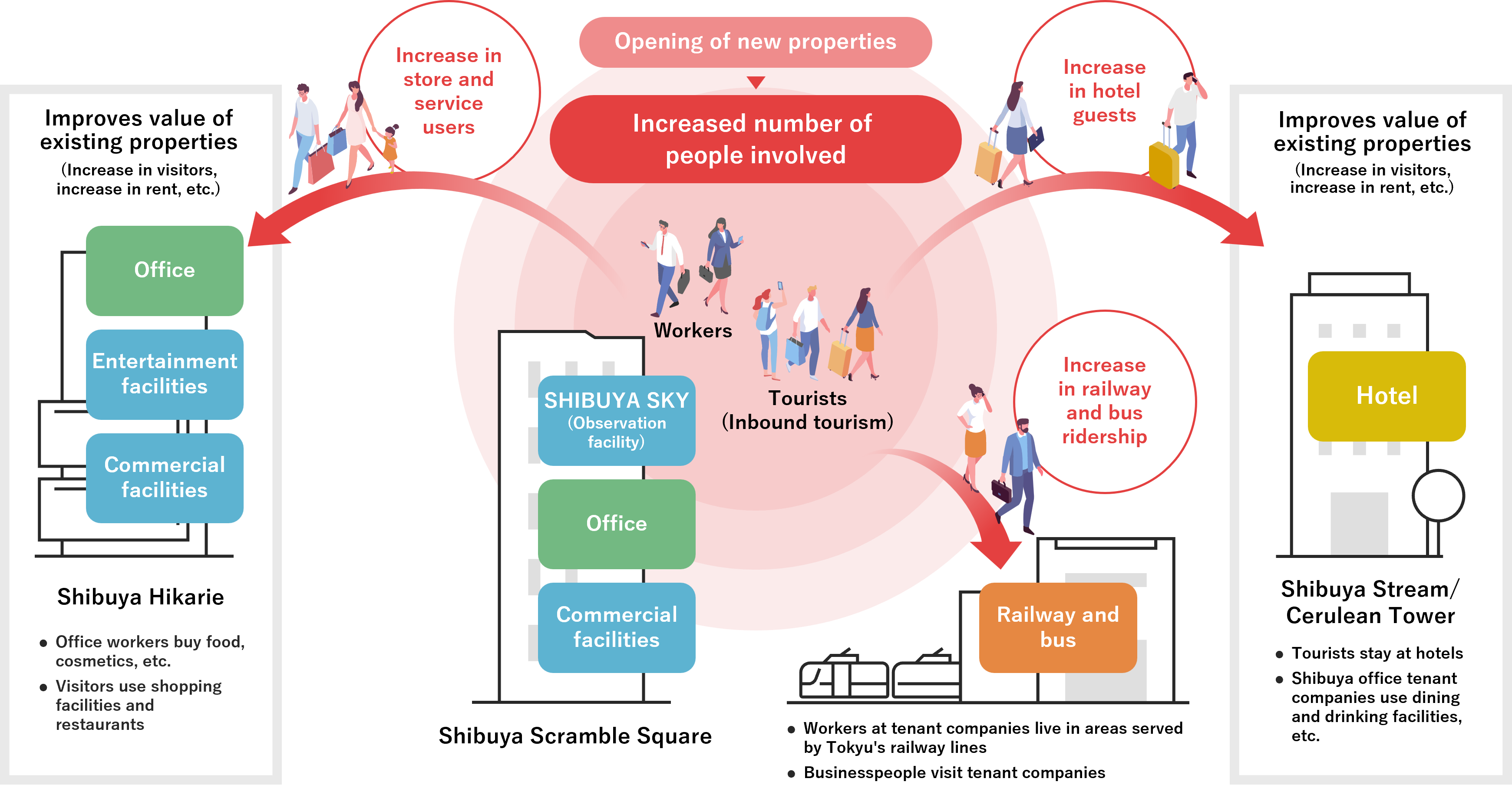 As shown in the example above, the opening of Shibuya Scramble Square greatly increases the population involved in the Shibuya area, including office workers and visitors, as well as inbound tourists visiting the rooftop observation deck. This will then lead to an increase in the use of commercial facilities, hotels, and services that we have developed in the surrounding area. (See figure below)