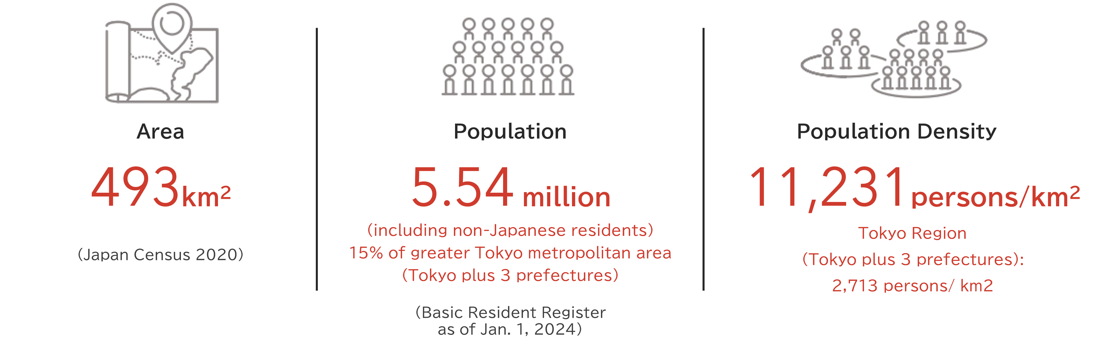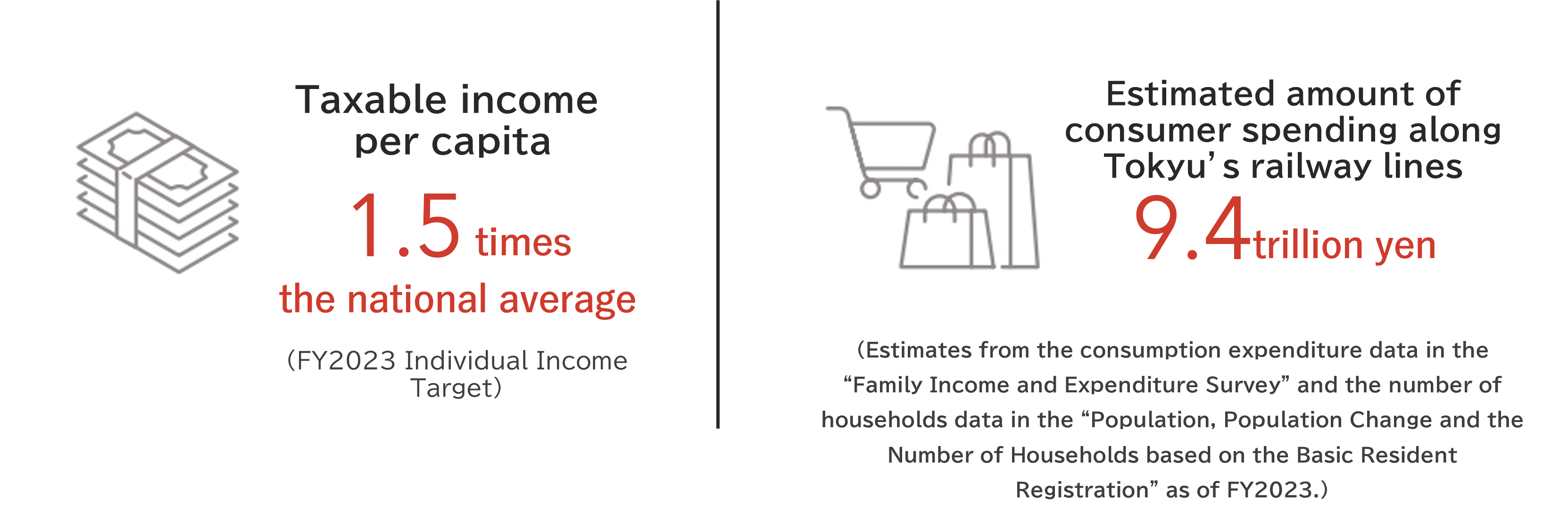 The areas served by Tokyu Lines are positioned in the southwest of Tokyo where 15% of the Metropolitan Area population is concentrated. Approximately 70% of our assets are concentrated in Shibuya and the areas served by Tokyu lines. We aim to further improve area value through concentrated investments in the areas.