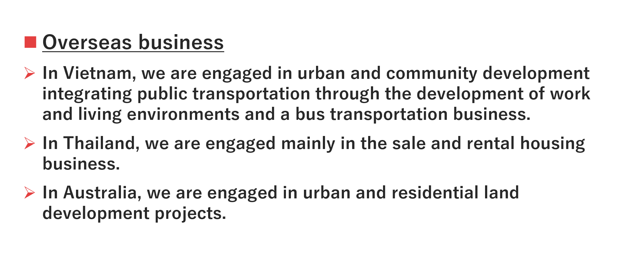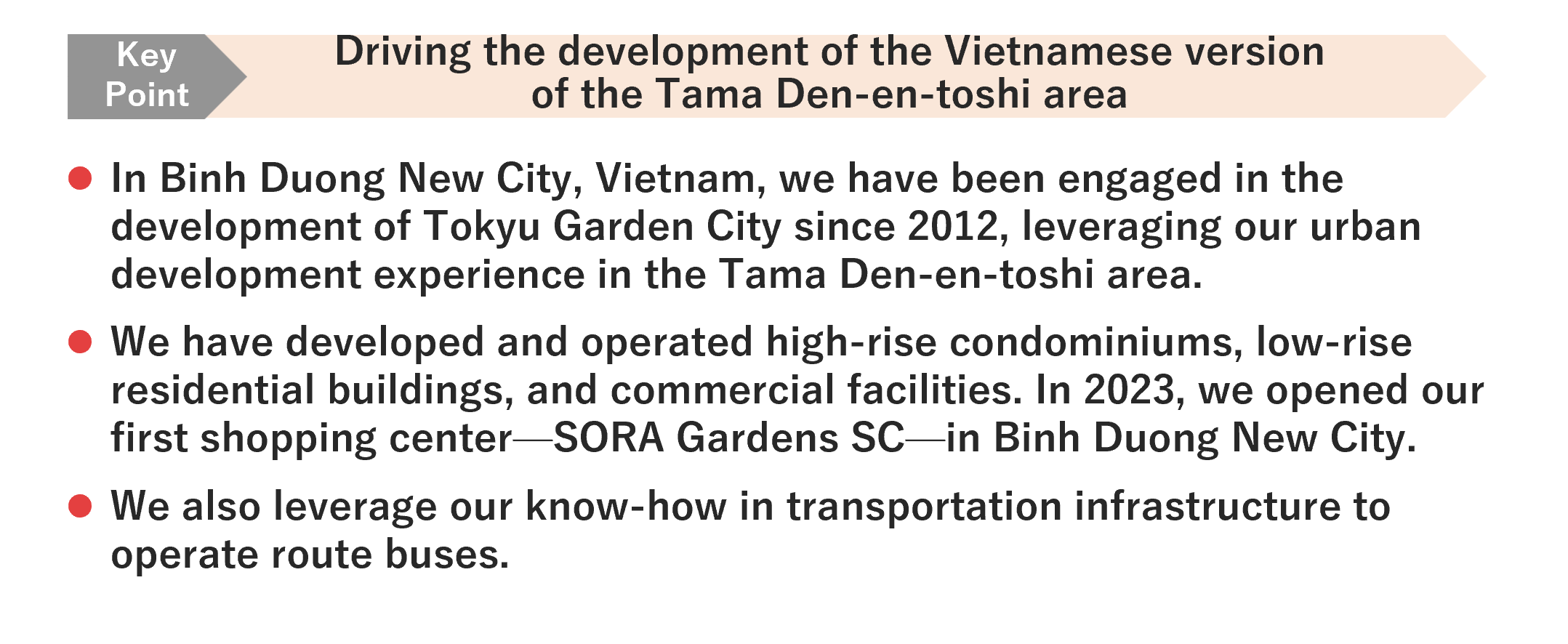 We are also developing our business overseas by leveraging our strengths, such as urban development in suburban cities based on our experience in the Tokyu Tama Den-en-toshi project.