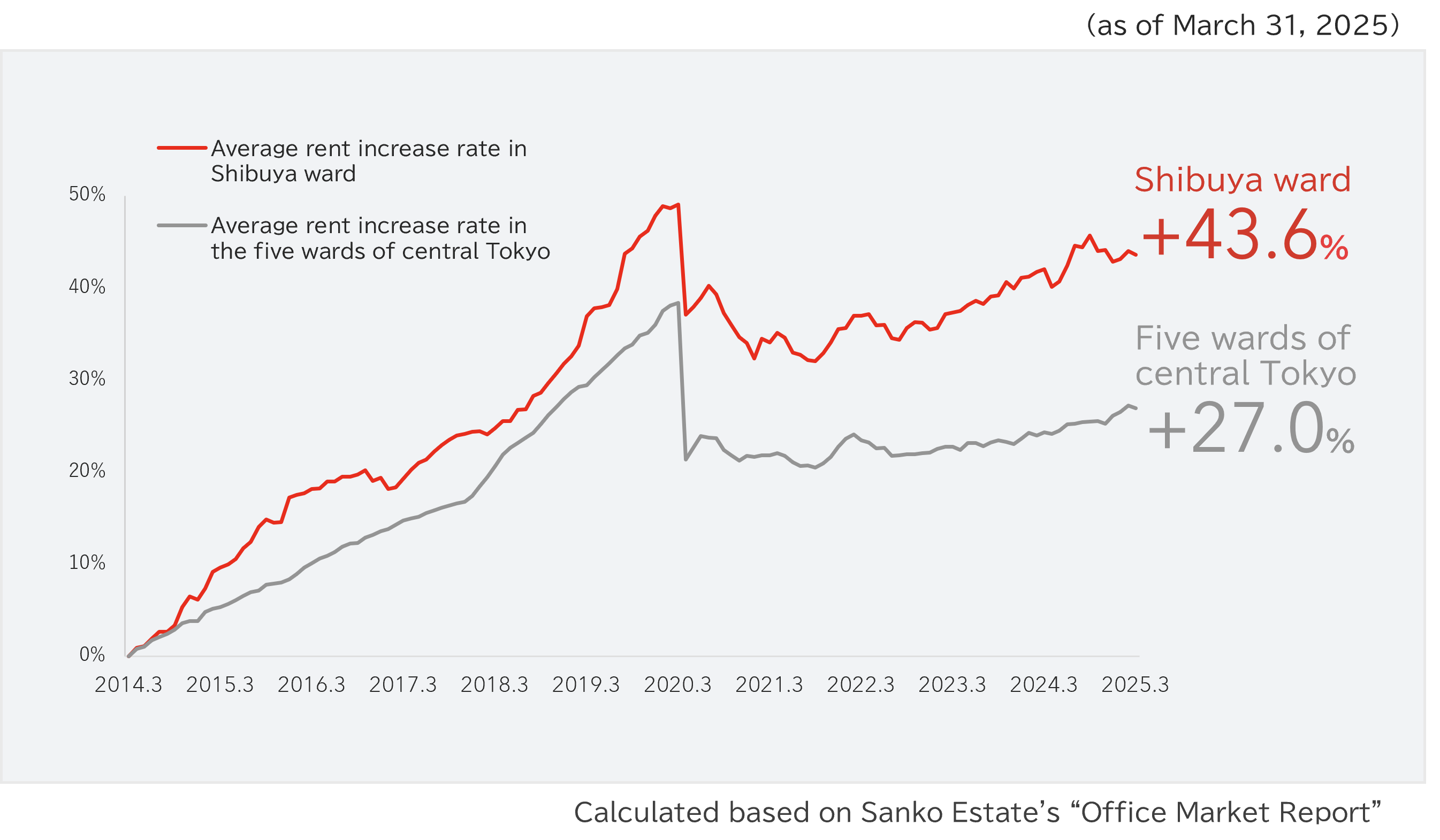 Office rent levels in Shibuya Ward are growing at a rate higher than the average of the five central wards of Tokyo.