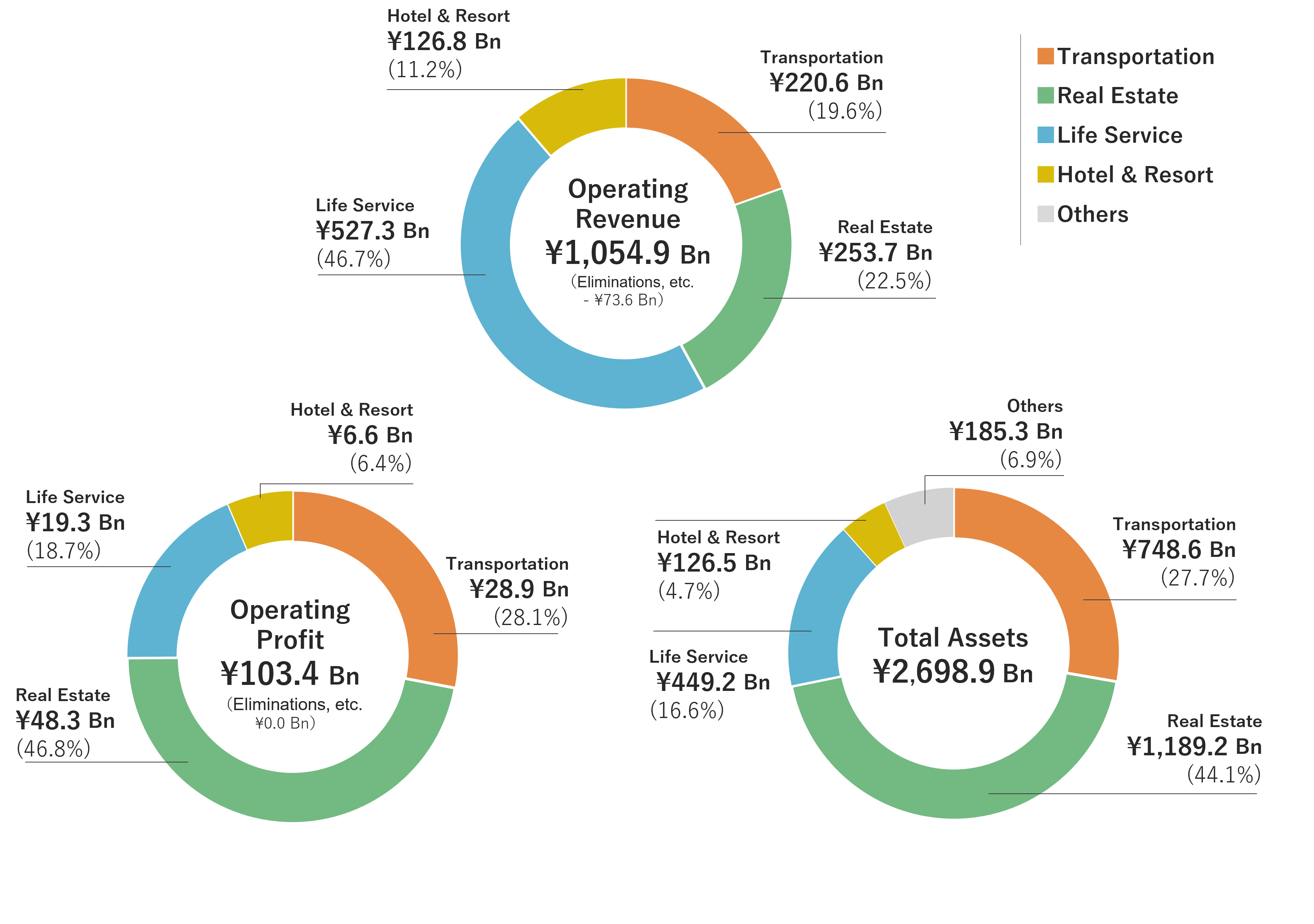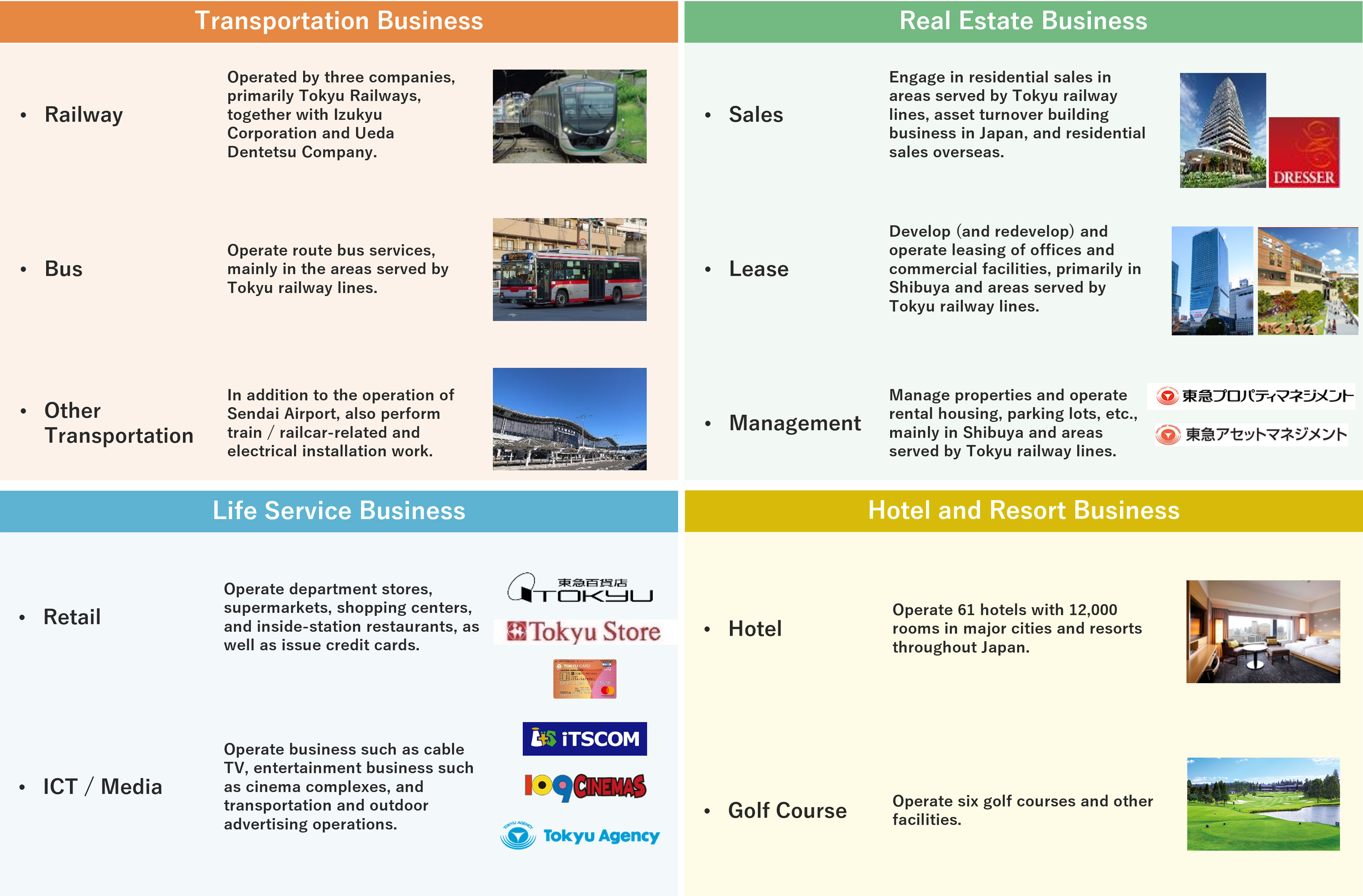 The Group consists of Tokyu Corporation, 128 subsidiaries and 41 affiliates. With operations in Transportation, Real Estate, Life Services, and Hotels and Resorts focusing on the areas along Tokyu’s railway lines, we engage in urban and community development from a long-term perspective and develop businesses that are closely linked to the lives of our customers.
