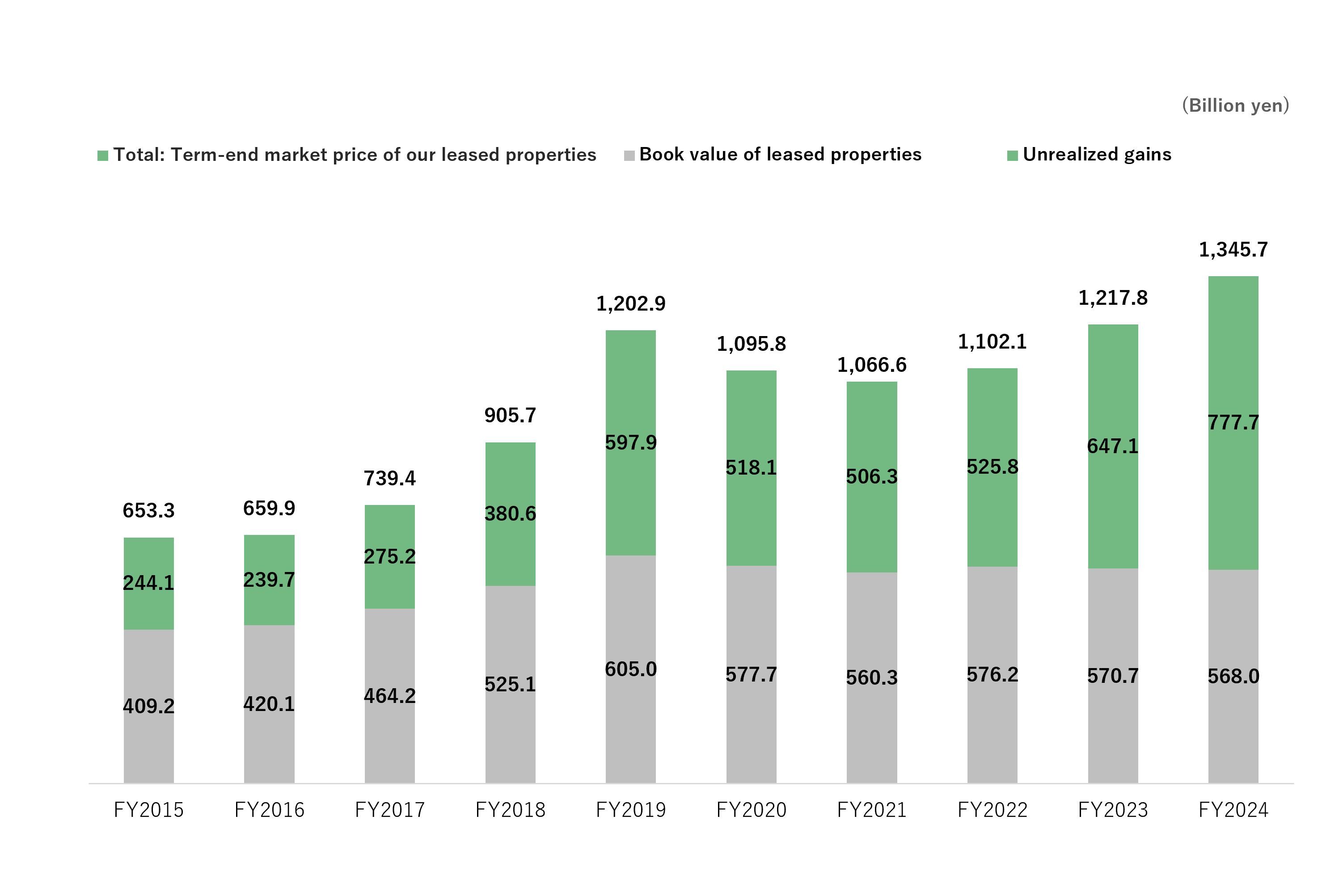 The openings of large-scale redevelopment projects centered around the Shibuya area and the improvement of the profitability of properties have led to an increase in unrealized gains.
