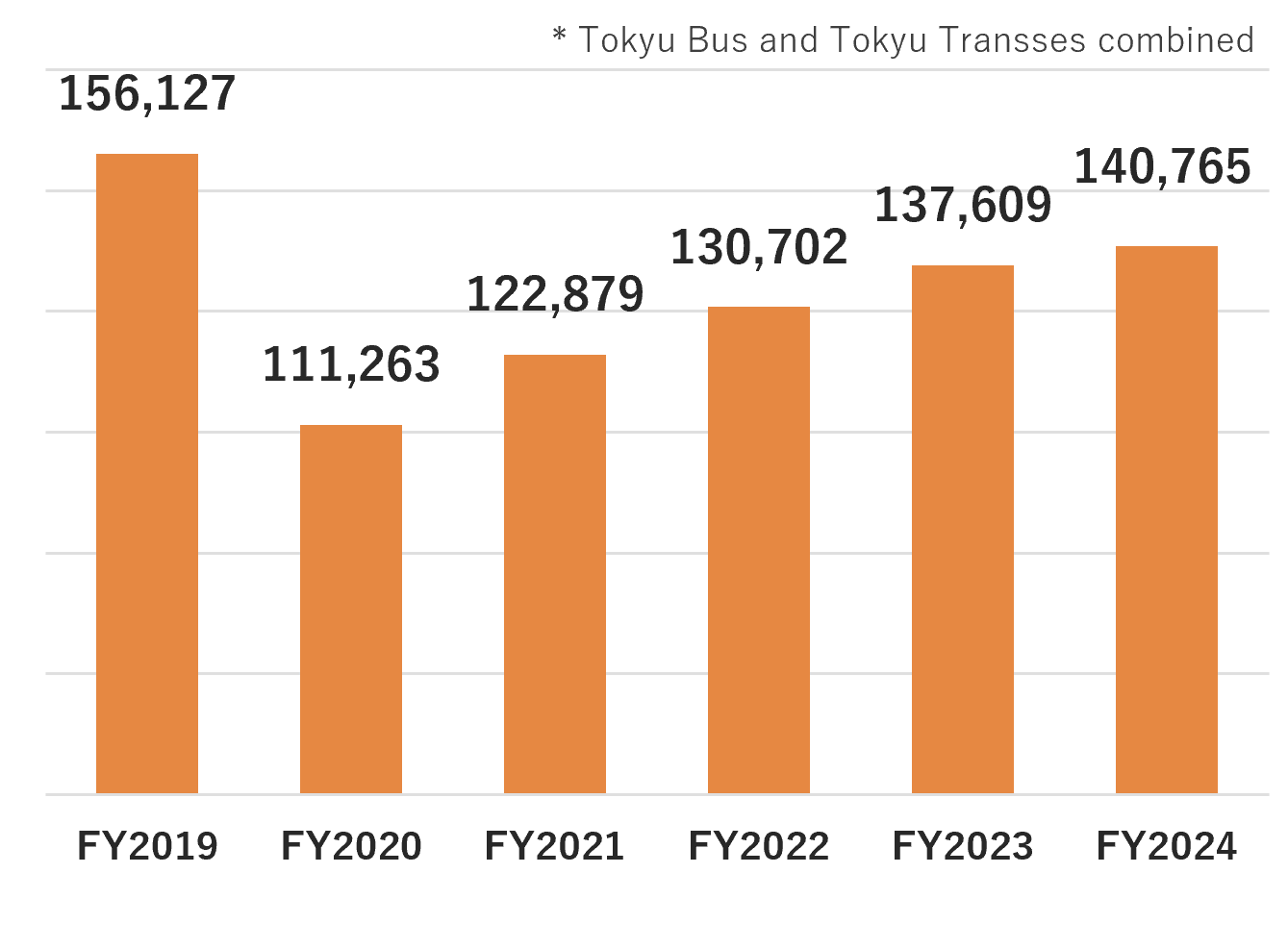 We provide route bus service mainly in areas served by Tokyu's railway lines according to local needs to increase convenience. With more than 900 vehicles in operation and a route network spanning approximately 1,500 kilometers, the total distance traveled in FY2024 reached around 34.6 million kilometers.