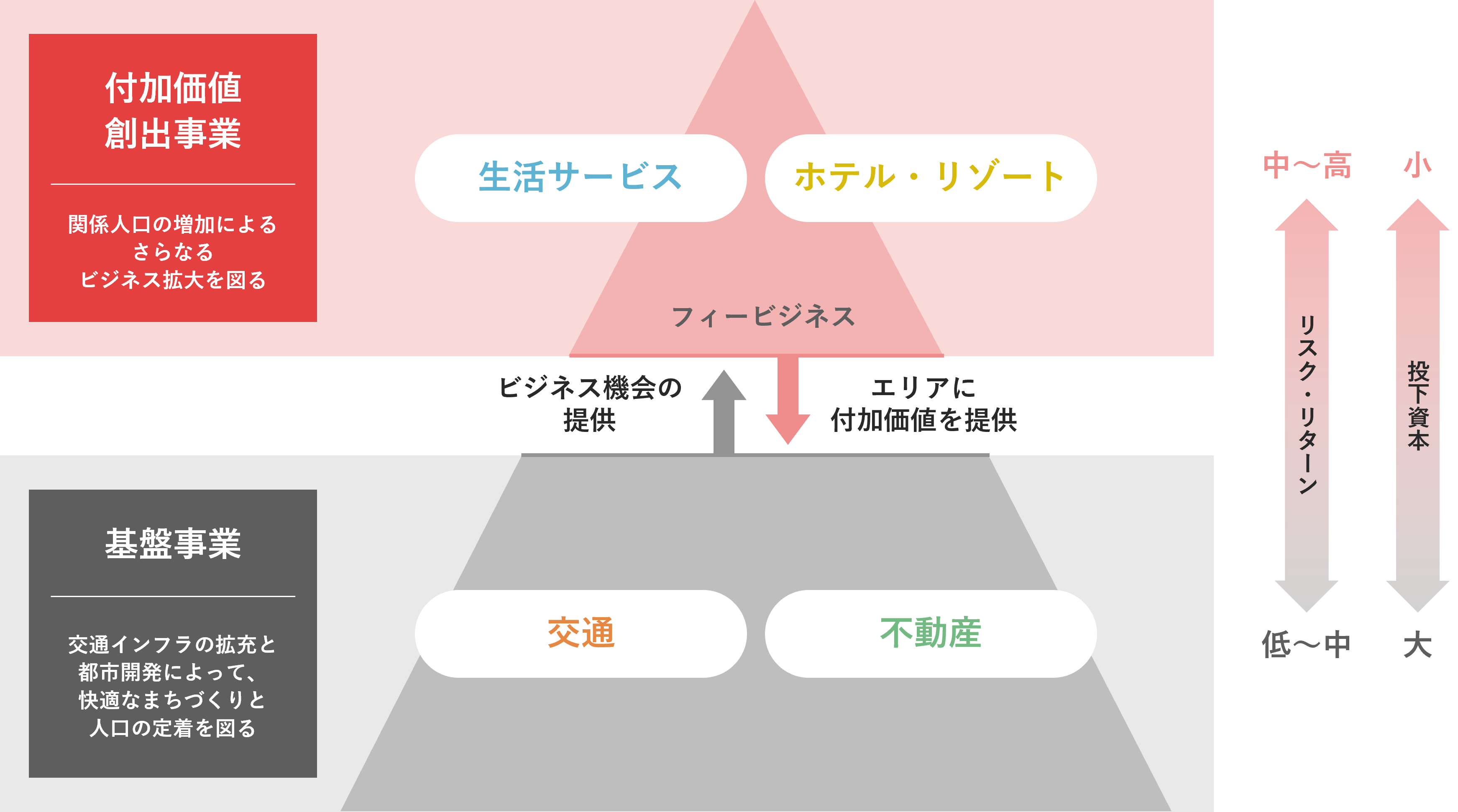 交通事業、不動産事業を基盤としながら、相対的に投下資本が少なく、高いリターンが期待できる、生活サービス事業、ホテル・リゾート事業を組み合わせて、エリア価値の向上と、利益拡大を図ります。