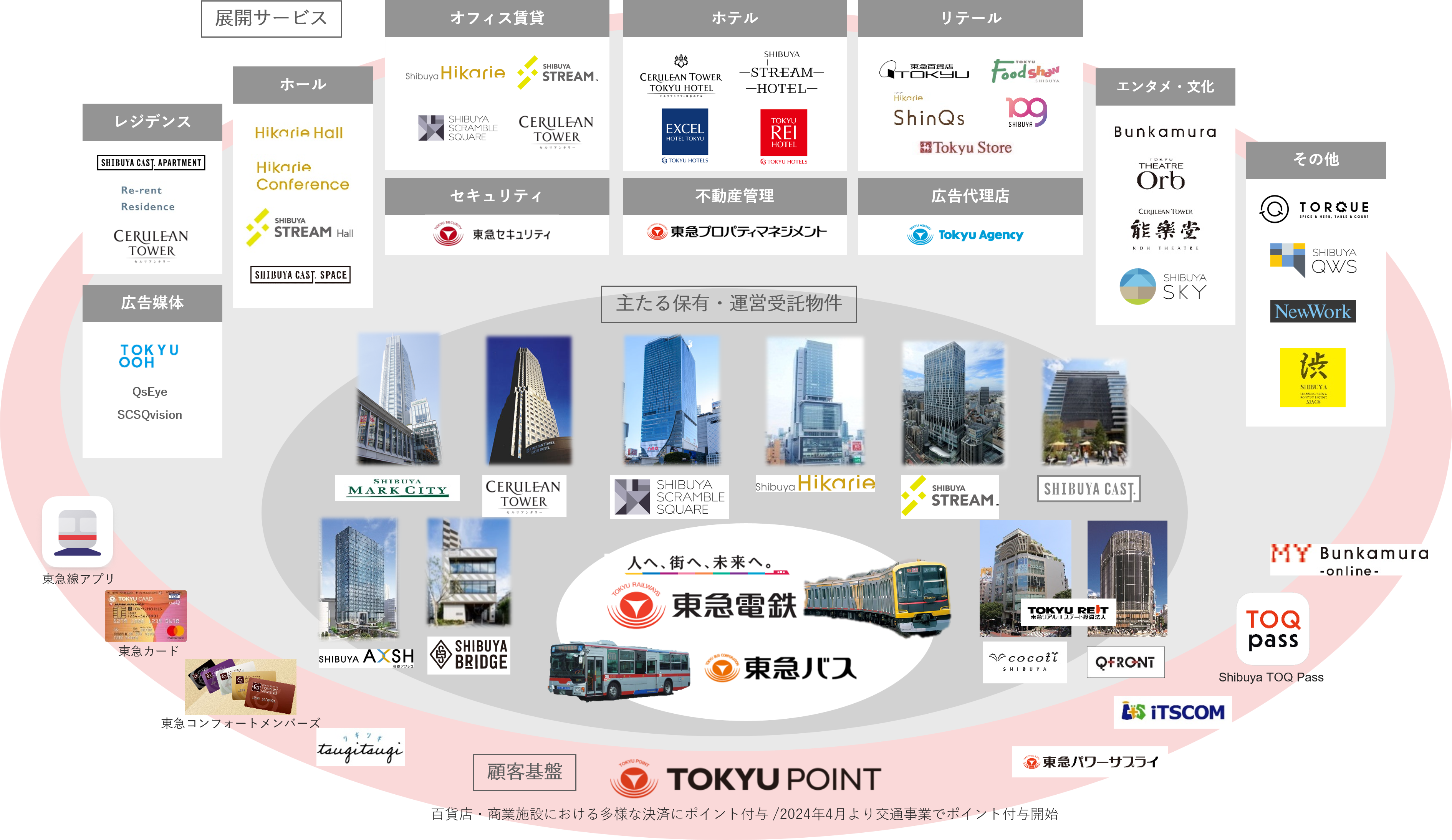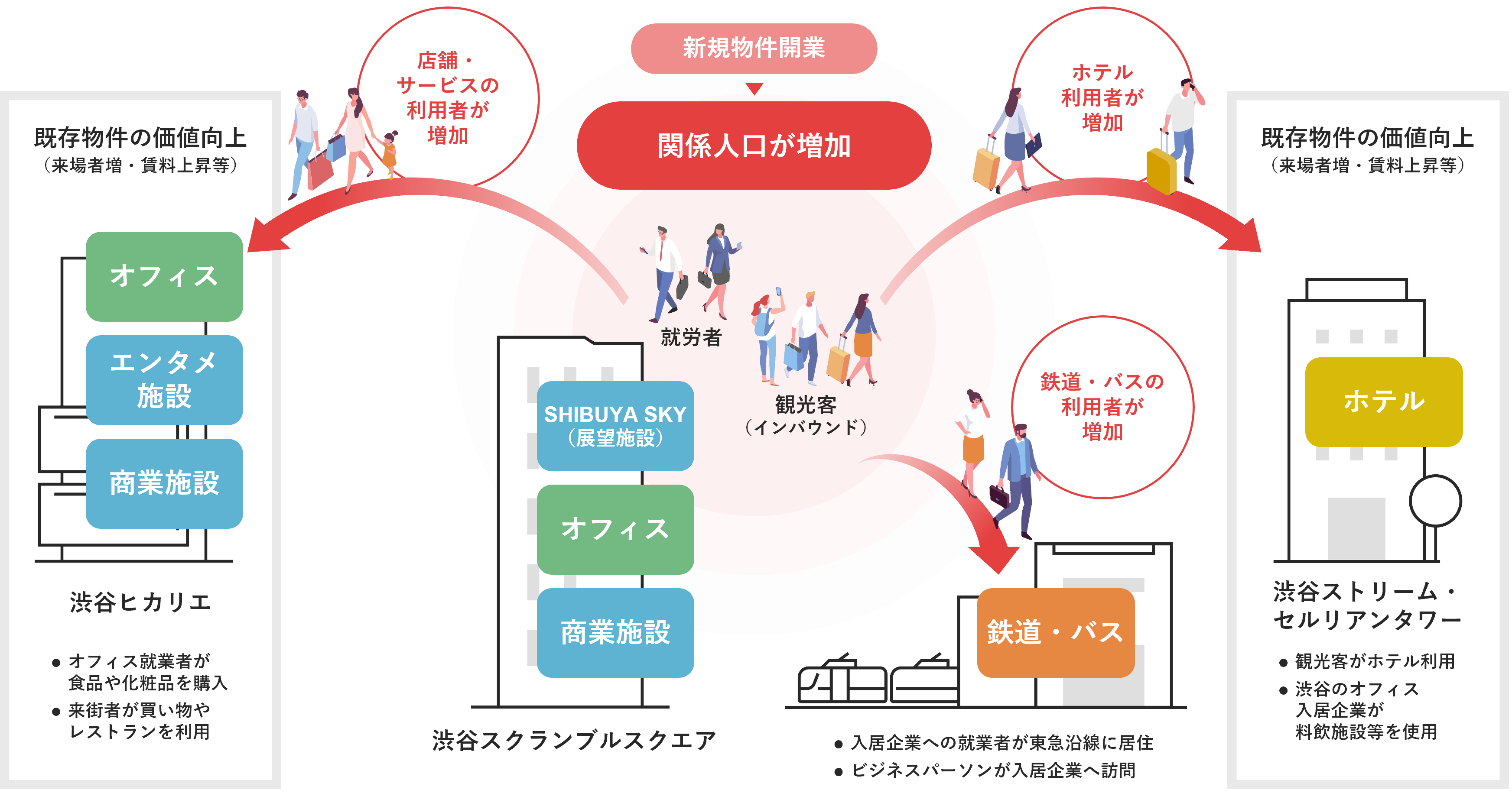 上の例のように、渋谷スクランブルスクエアが開業すると、オフィスの就労者や訪問者をはじめ、屋上展望デッキを訪れるインバウンド観光客など、渋谷エリアの関係人口が大きく増加します。そして、当社が周辺で展開している商業施設やホテル、サービスなどの利用増につながっていきます。(下図参照) また、新規物件の開業は、オフィス入居企業の従業員の東急線沿線移住も期待でき、沿線における当社の鉄道やバス、スーパー等の利用へと広がっていきます。