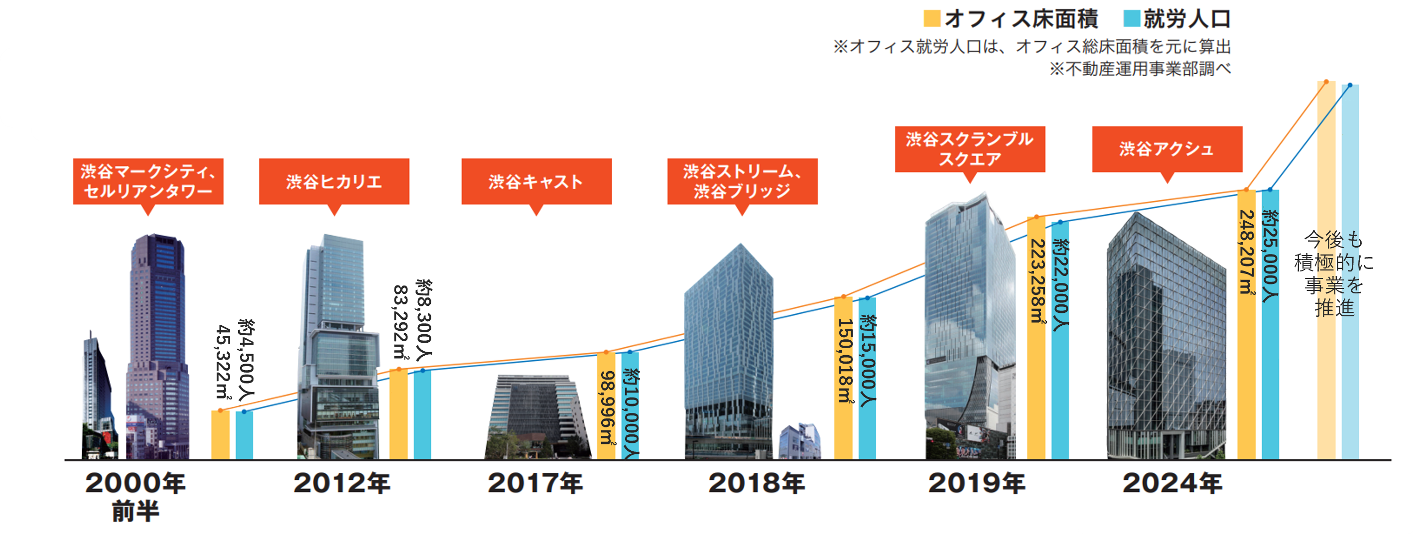 渋谷における就労人口・来街者は、2000年から当社が継続して開発・供給しているオフィスの増加により、着実に増加してきました。今後も、積極的に事業を推進し、さらなる関係人口増加、相乗効果の創出、そしてエリアの持続的な成長を目指していきます。