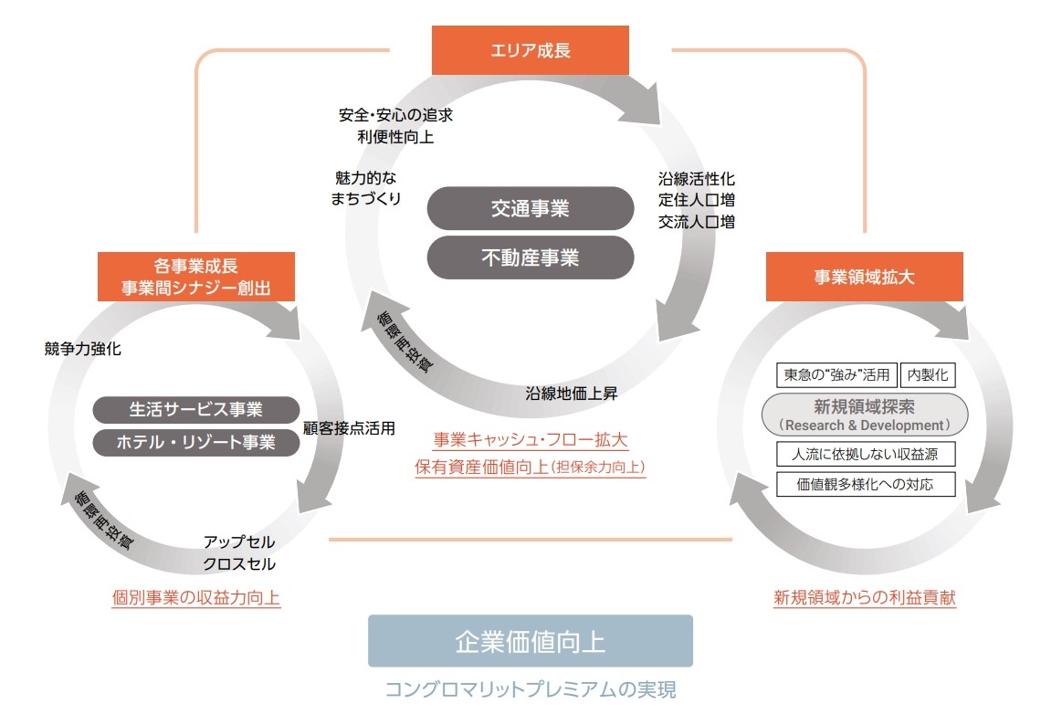 エリア成長と事業間シナジーにより持続的な企業価値向上を実現するのが長期循環型ビジネスモデルです。3つのサイクルのシナジーを最大化し、コングロマリットプレミアムを実現します。