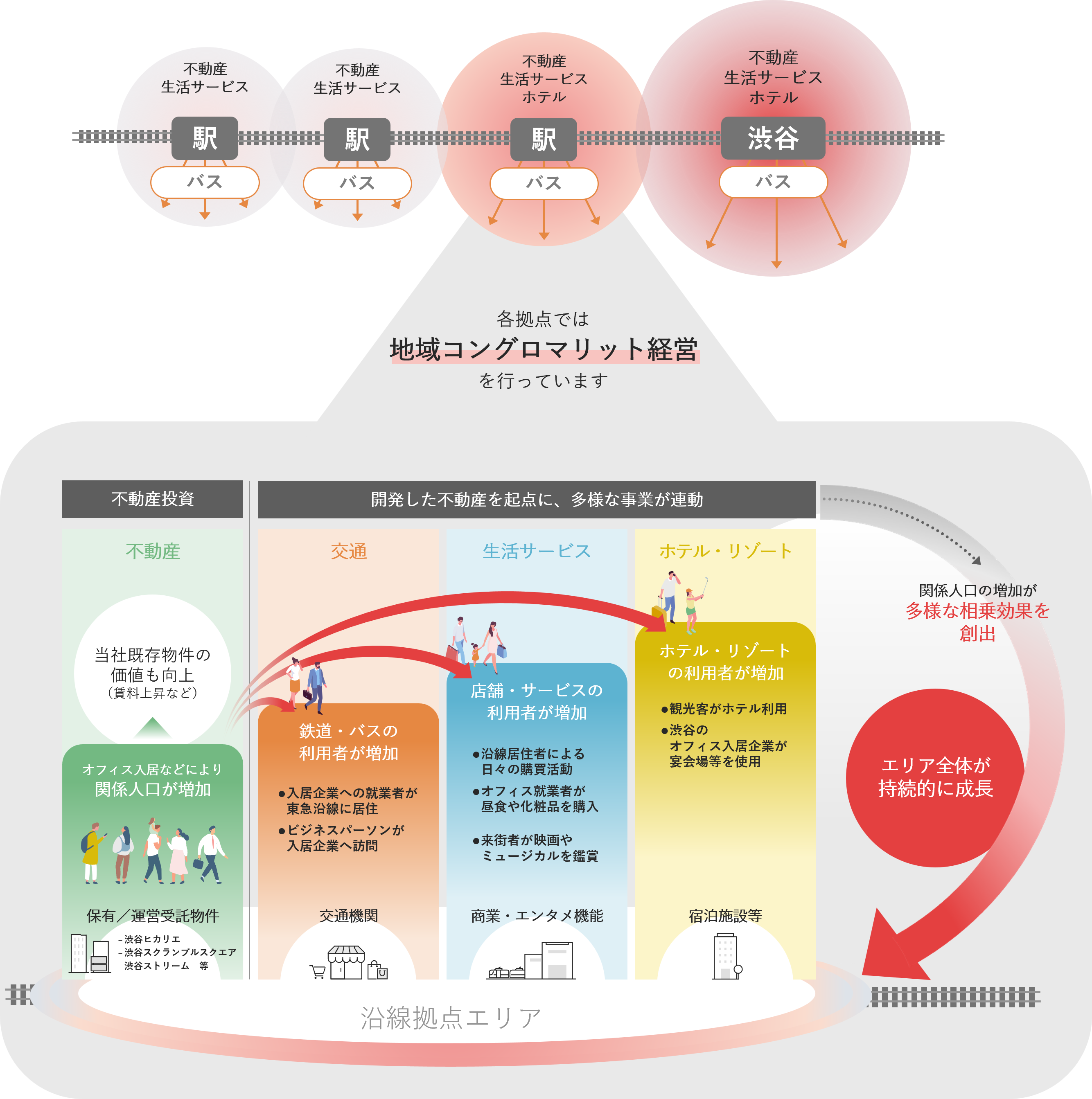 当社は、不動産開発をフックとしてエリアへ人口を吸引し、他事業にも波及させることで、追加的なリターンを獲得しています。エリアへの追加的な投資(循環再投資)を継続的に行うことで、エリア価値を向上させ、複層的に収益を上げるのが「地域コングロマリット経営」です。