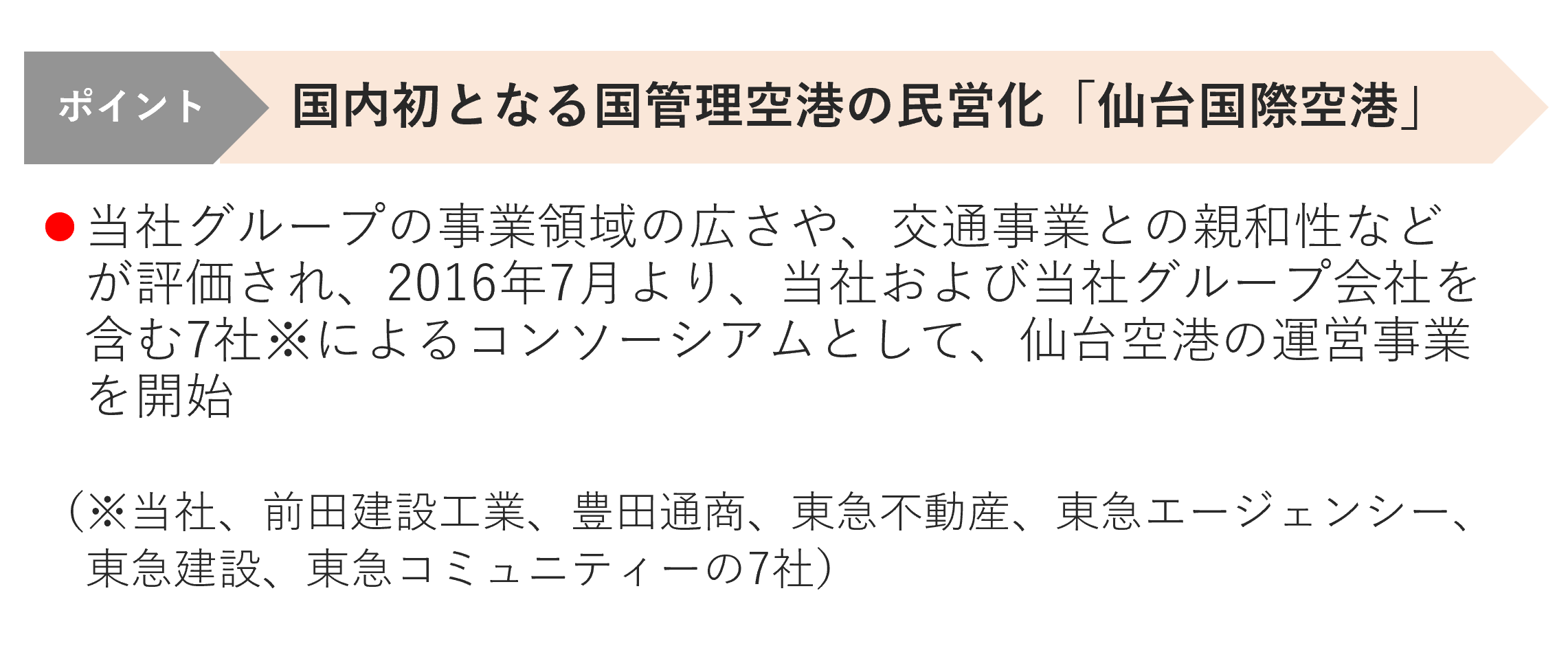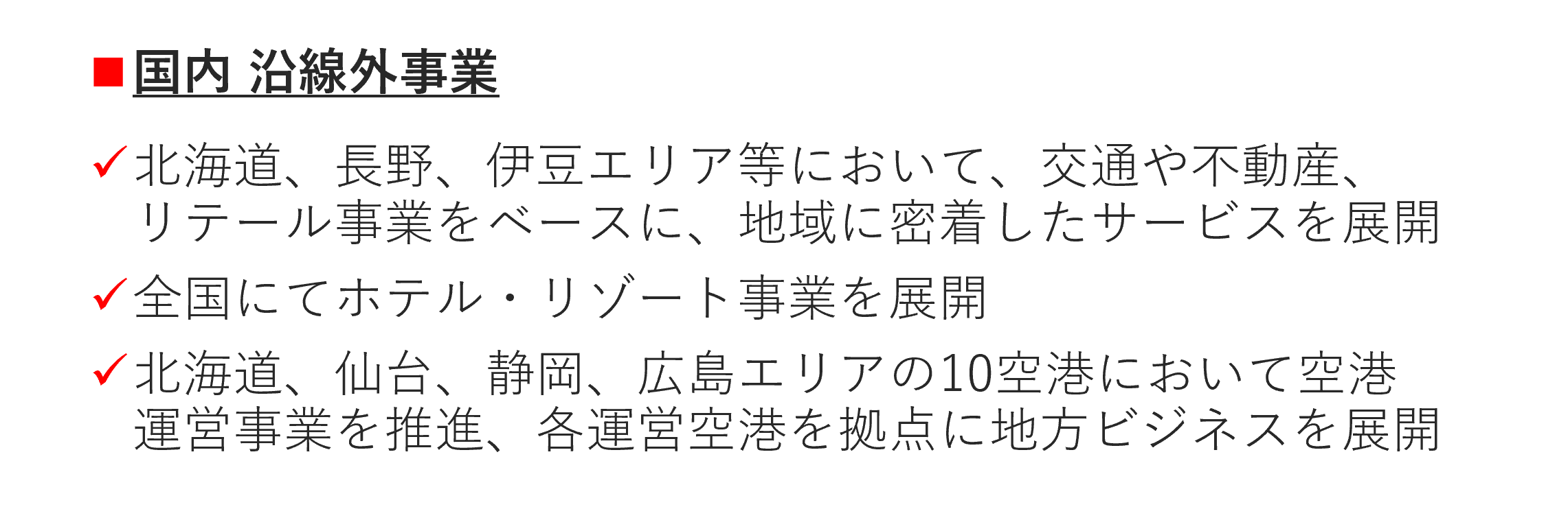 特に空港運営事業は、安全を基軸とした交通事業との親和性が高く、当社の新事業として各地域の空港運営受託を行っています。
