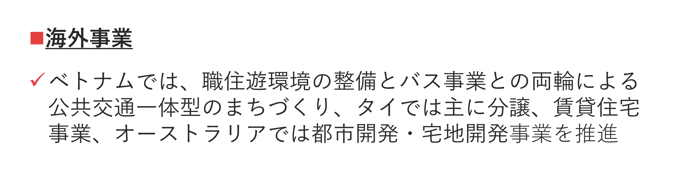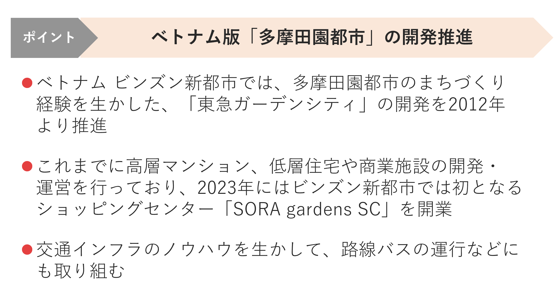 多摩田園都市での経験を生かした郊外都市におけるまちづくりなど、海外でも当社の強みを活かした事業を展開しております。