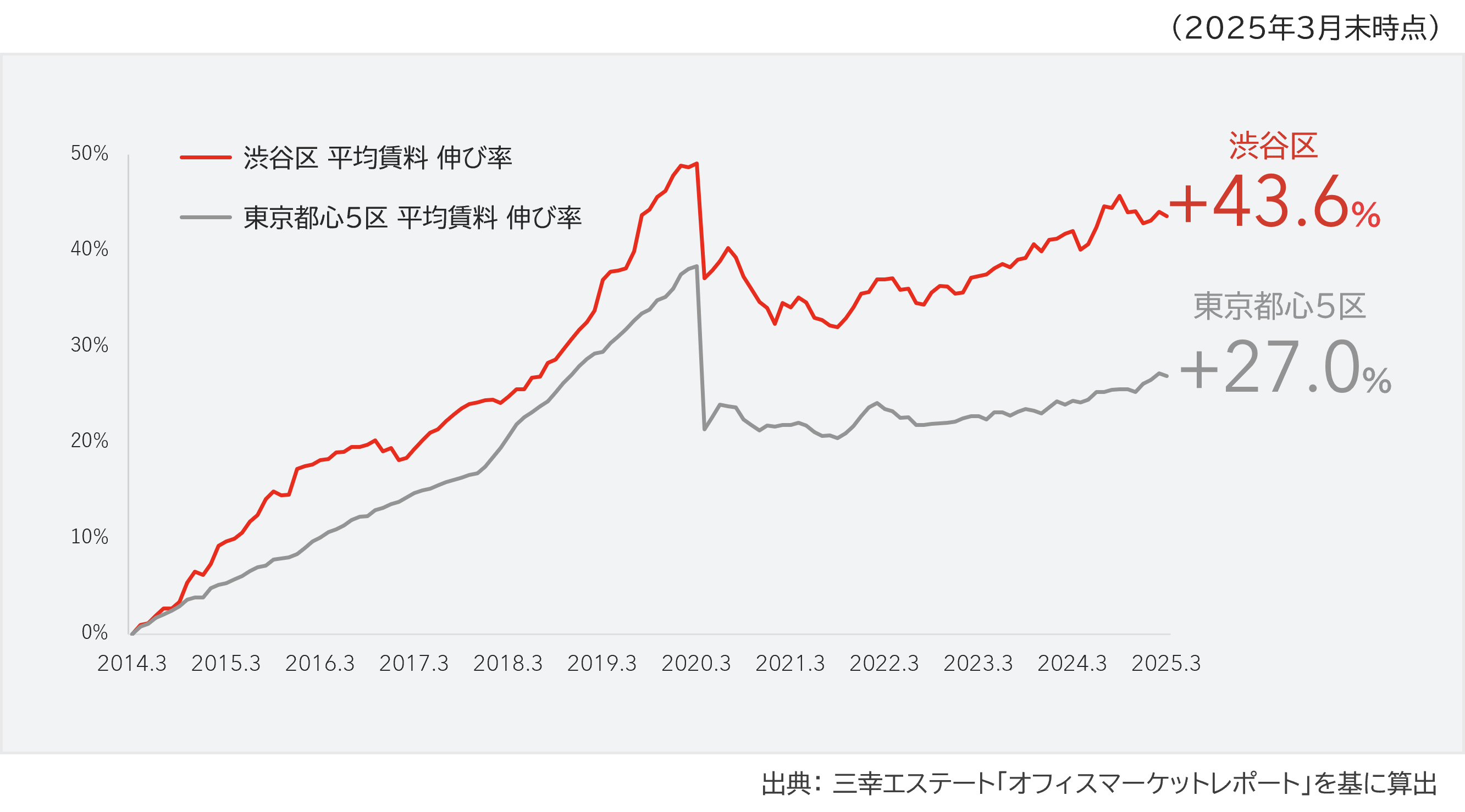 渋谷区のオフィス賃料水準は、東京都心5区平均を上回る伸び率で成長しています。