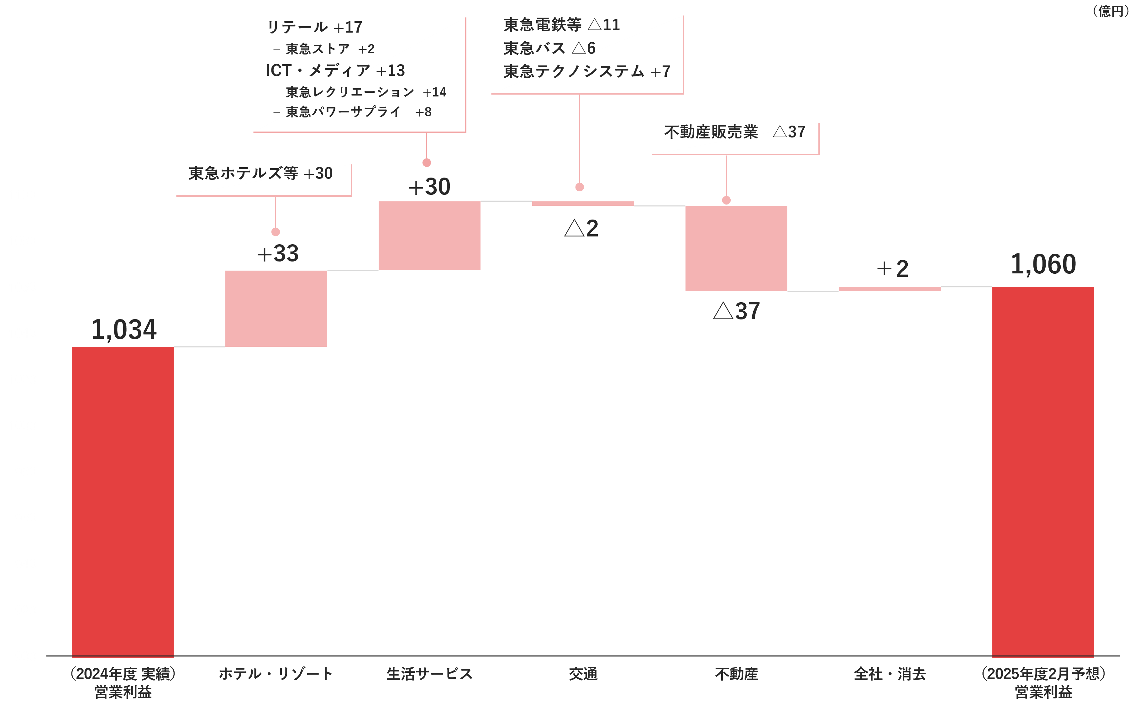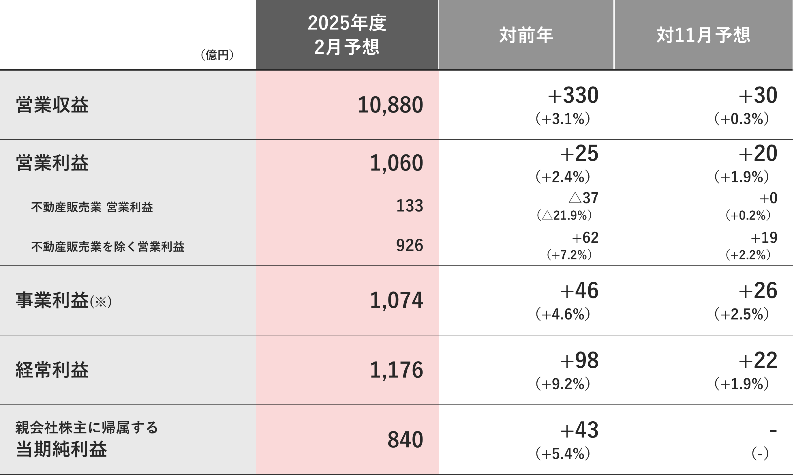2026年3月期の連結業績予想につきましては、不動産事業における前年度からのマンション販売の反動減がある一方で、交通事業における利用者の増加や、ホテル・リゾート事業で良好な事業環境が継続すること等を見込み、営業収益は10,880億円(前年同期比3.1%増)、営業利益は1,060億円(同2.4%増)、経常利益は営業利益の増加に加え、持分法投資利益の増加等を織り込み、1,176億円(同9.2%増)を見込んでおります。