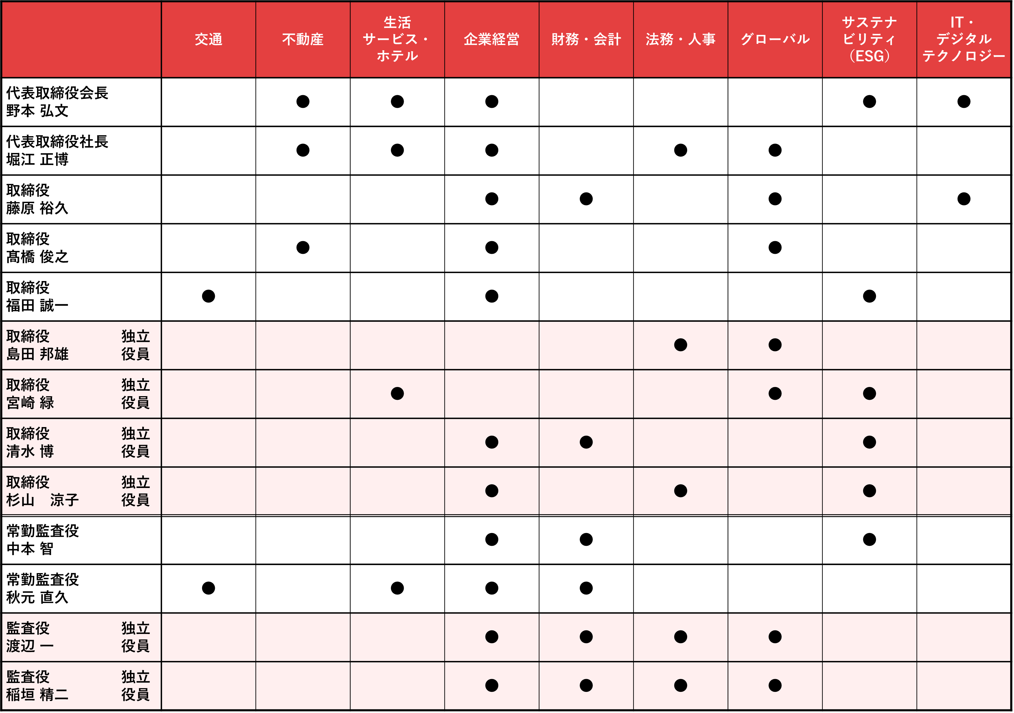 当社では、取締役会全体としての知識・経験・能力・専門分野についての多様性および構成のバランスに配慮し、経営者としての豊富な経験や当社の事業分野に対して優れた見識を有する候補者を取締役および監査役に選任しています。